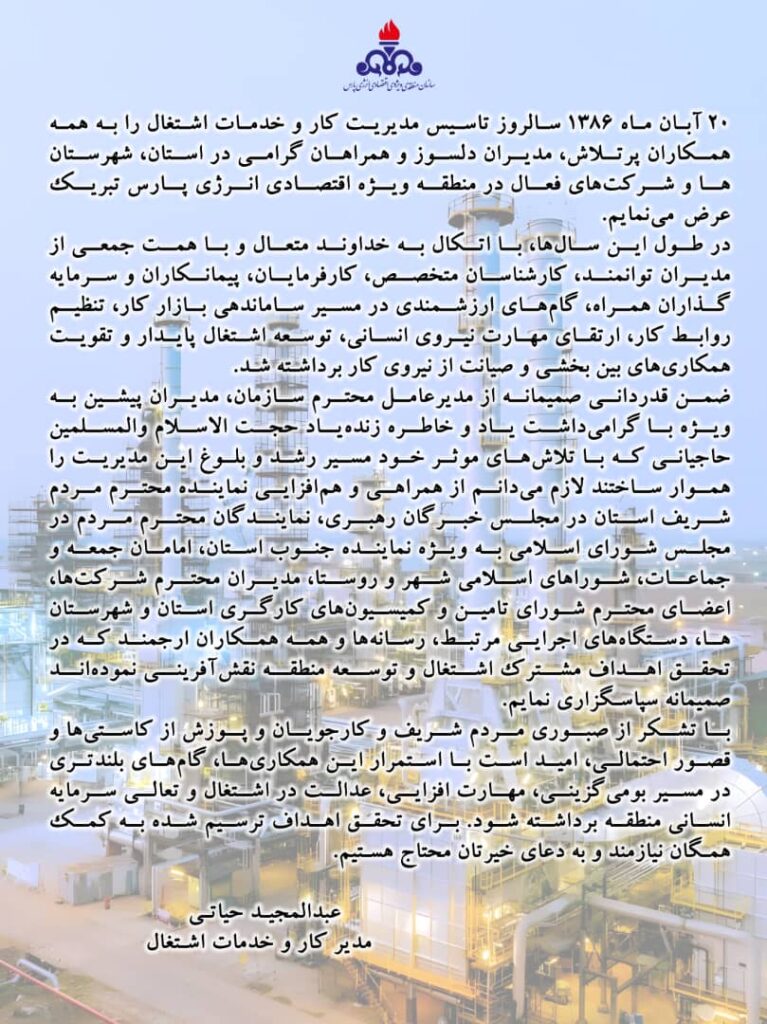 پیام عبدالمجید حیاتی به مناسبت سالروز تاسیس مدیریت کار و خدمات اشتغال منطقه ویژه